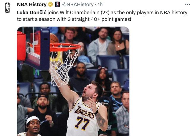 憑借這樣的表現,東契奇成為張伯倫后NBA歷史上第二位能夠在開季至少三場比賽中連續交出40+得分的球員,張伯倫曾在61-62賽季和62-63賽季連續兩個賽季做到這一壯舉。