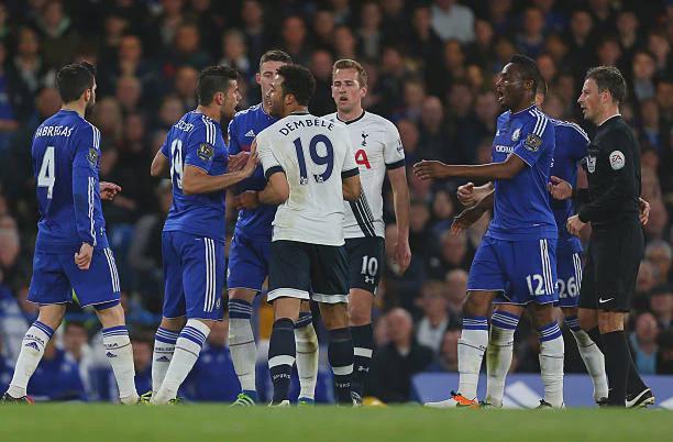 比賽開始后,雙方的身體對抗強度極大,比賽只進行55分鐘就有4人染黃。然而,比賽的轉折點出現(xiàn)在第59分鐘,當時熱刺中場卡布爾對埃托奧犯規(guī)被直紅罰下,阿扎爾罰入點球,將比分改寫為2-0,比賽的天平徹底失衡。